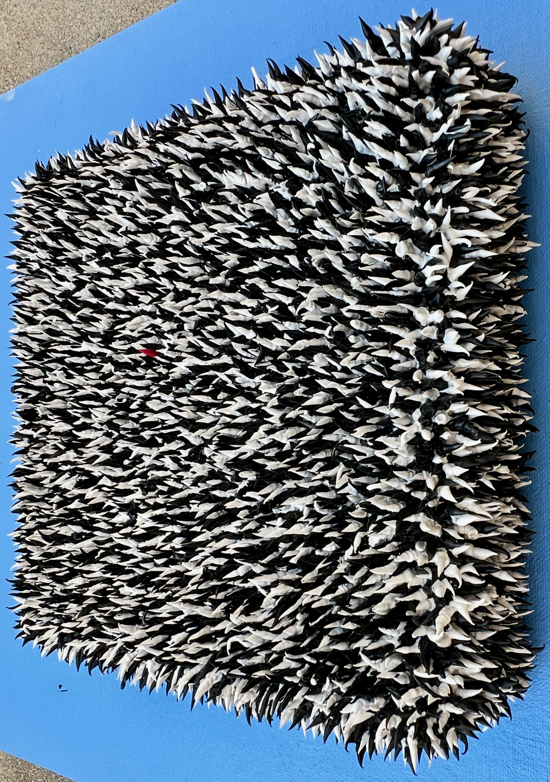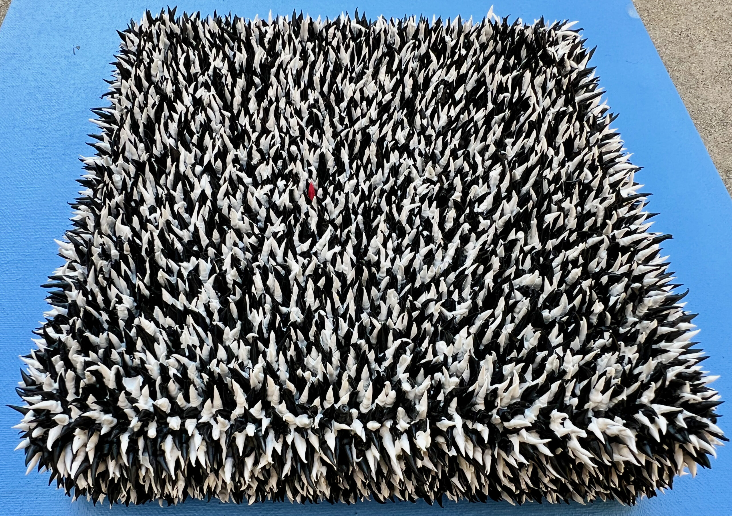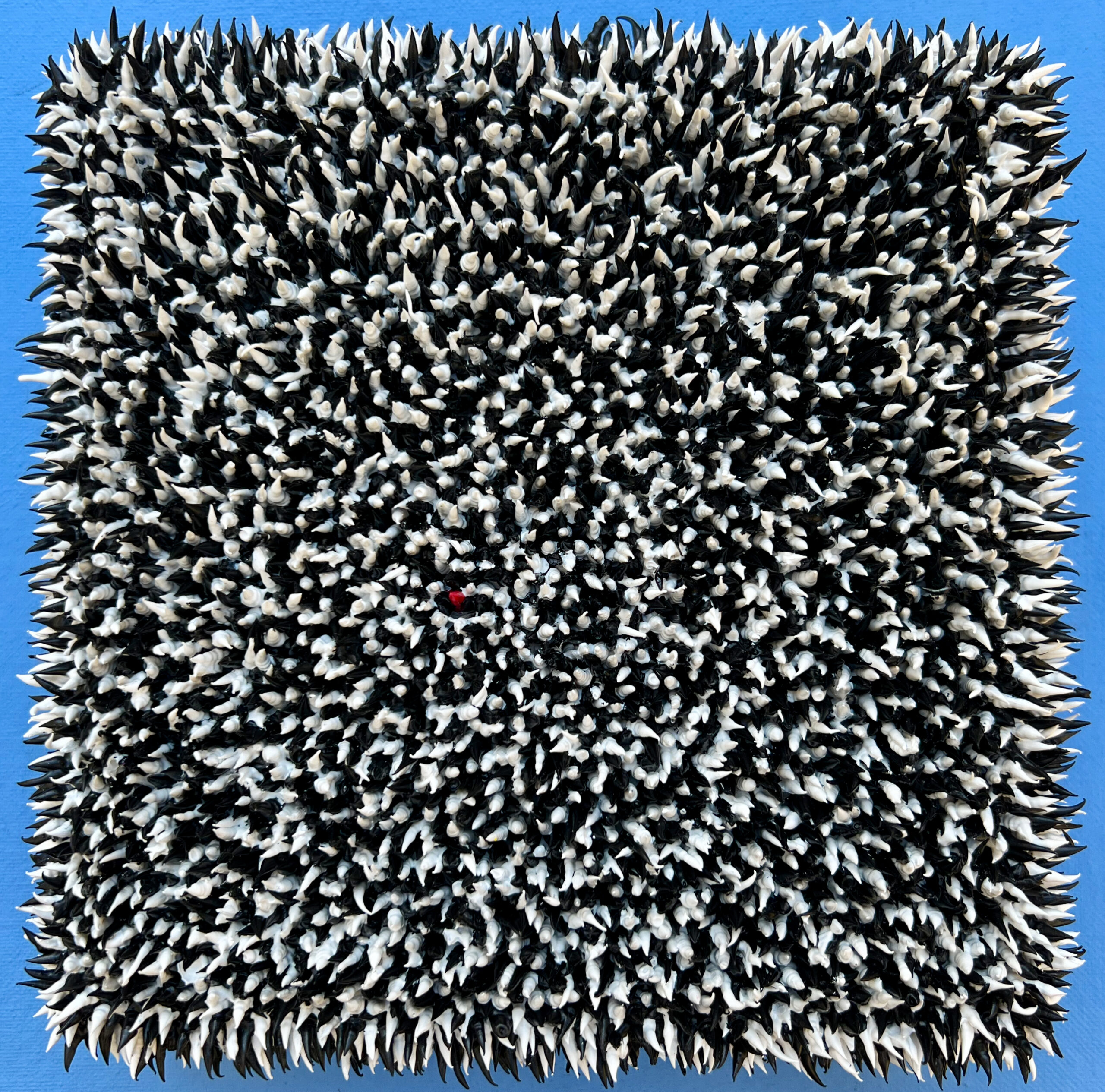 Always Stand Out in the Crowd is a captivating artwork that draws the viewer into a dense, monochromatic field of pointed, clustered shapes resembling abstracted spikes. Dominated by shades of black, and white, the composition appears chaotic and textured, inviting a sense of movement and energy. Amidst the seemingly overwhelming crowd, a single, tiny red spot emerges near the center, instantly capturing attention. This small yet vibrant element symbolizes individuality and resilience, standing defiantly amidst the uniformity of the masses. This piece speaks to the importance of maintaining one’s uniqueness in a world that often values conformity.