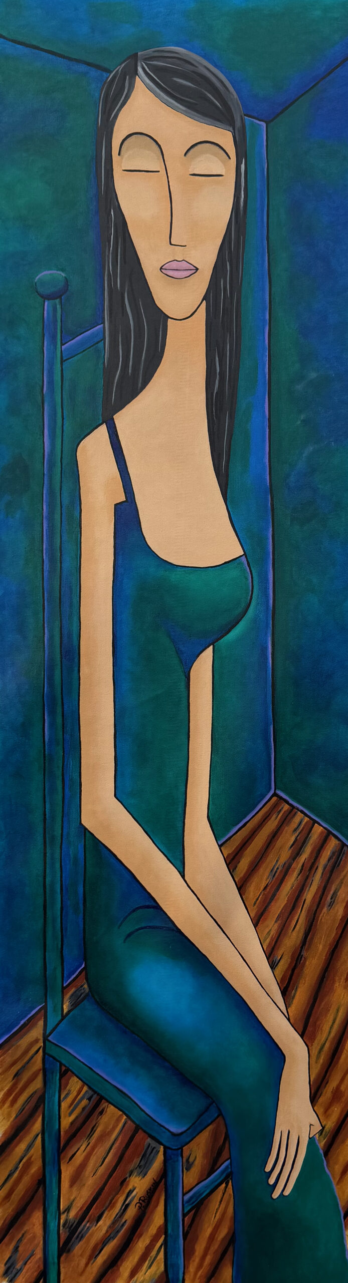 What She Doesn’t Say is a quiet, introspective portrait that captures the space between thought and expression. The elongated figure, seated with eyes gently closed, radiates a sense of stillness and inward reflection. Her posture is calm, yet weighted with unspoken emotion, suggesting a story carried silently within.